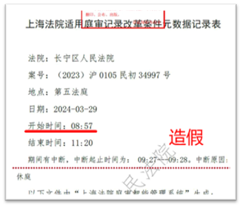 造假记录】“期间有中断,中断起止时间为:09:27---09:28。中断原因:休庭”。