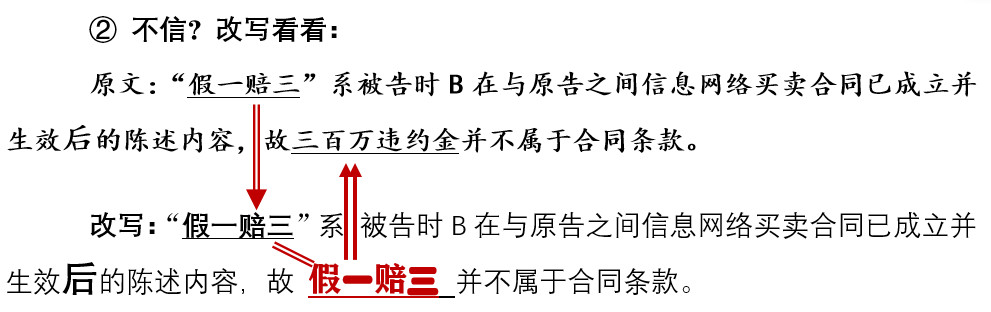 (5)根据交易习惯,依据相关法律应得到的结论 前文有证据证明被告1“假一赔三”是按市场价(实际价值、标价、估价)三倍计算,不是通常含义价款的三倍,已经达成共识。 所以《判决书》1199元三倍的通常含义依法不予支持,应按市场价——实际价值100万*3来履行,三套共900万。此处判决适用法律应是“《民法典》合同法”。 (6)关于“三倍”的具体标准_《判决书》中法官的反言 ① 法官首先肯定了市场价三倍 《判决书》第16页,由此可见,原告系在被告时B陈述“达到百万级别、天然缅甸A货”之后即先后下单购买1199元的案涉商品三件,原告与被告时B达成的系三份“1199元购买达到百万级别天然缅甸A货”的合同,“假一赔三”系被告时B在与原告之间信息网络买卖合同已成立并生效后的陈述内容,故三百万违约金并不属于合同条款。 不论是否属于合同条款,从逻辑上可以看出:本案“三百万违约金”就是“假一赔三”的计算结果。||| 逻辑同一律 不信?改写看看: 改写后这句很好理解,前后“假一赔三”严格对应,并且叙述符合逻辑。改写表达的意思没变,是按照法官思路从合同中把“假一赔三”去除。这里只想论证“三百万违约金”与“假一赔三”是等效对应关系,“三百万违约金”即“假一赔三”。如此一看便知。此为逻辑正论。还有逻辑反论: 法官挖空心思否定合同有“假一赔三”,怕什么呢?那就是合同假一赔三是一百万三倍,不是普通假一赔三1199元三倍。如果是普通的假一赔三,主播也不用说,因为是常识,说与不说,都在那里,没有吸引力、没必要说、浪费口舌。所以反推案中“假一赔三”不一般。||| 排中律_二取一。